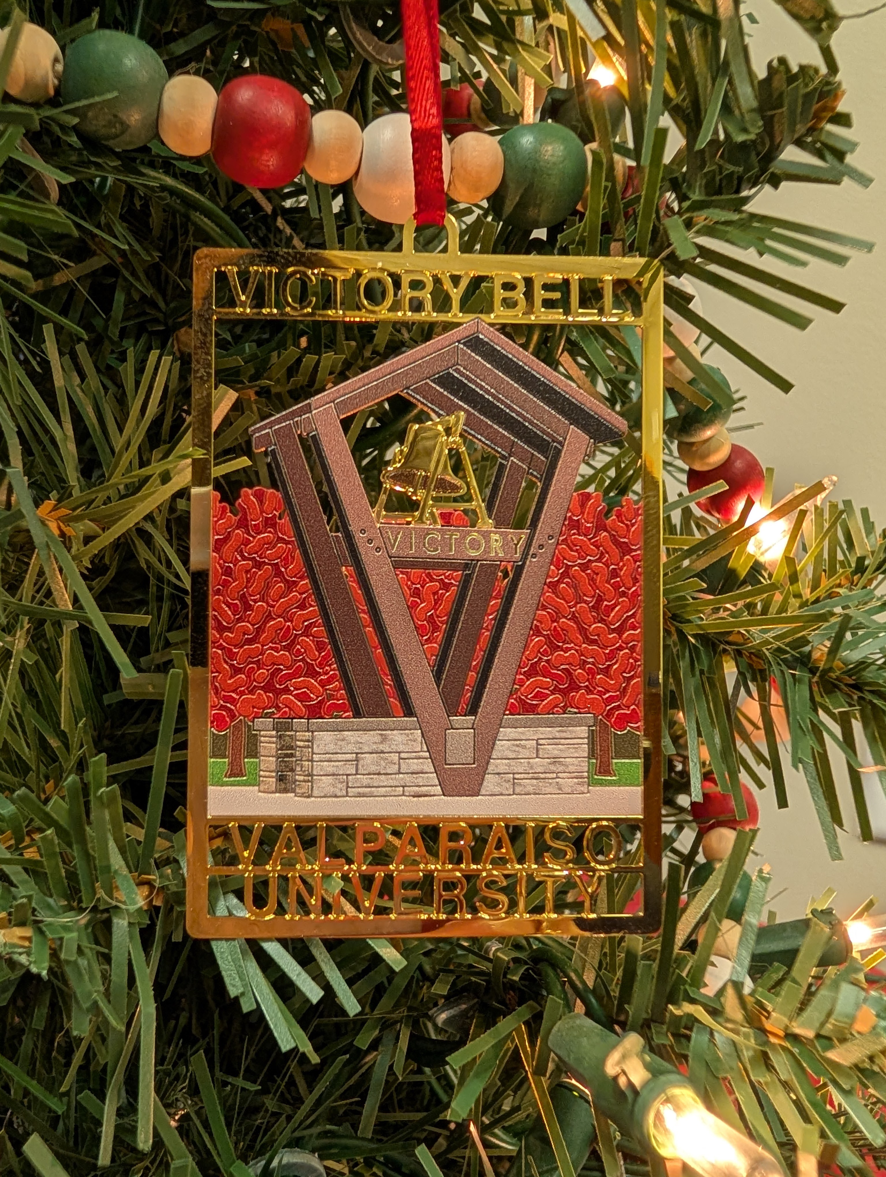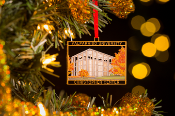 The 2025 ornament is: “Victory Bell in Autumn," suggested by Valparaiso University students in 1948, the Victory Bell is a cherished tradition. Once near the old Union, it now stands outside the ARC. Students ring it after athletic wins, Commencement, or other major celebrations, symbolizing pride and community spirit.